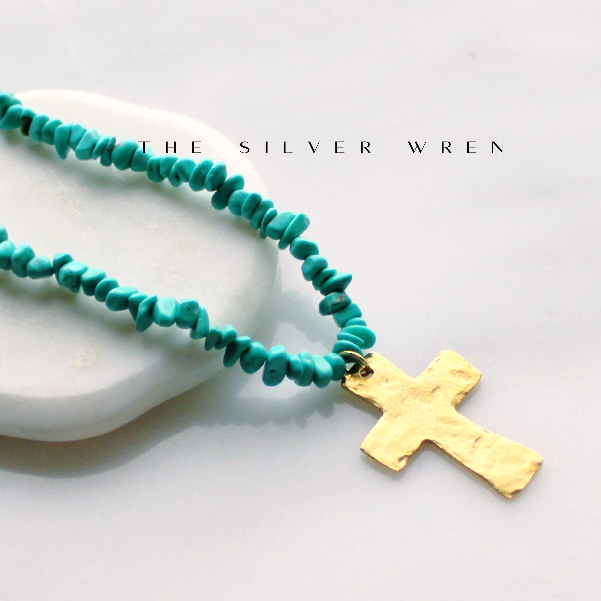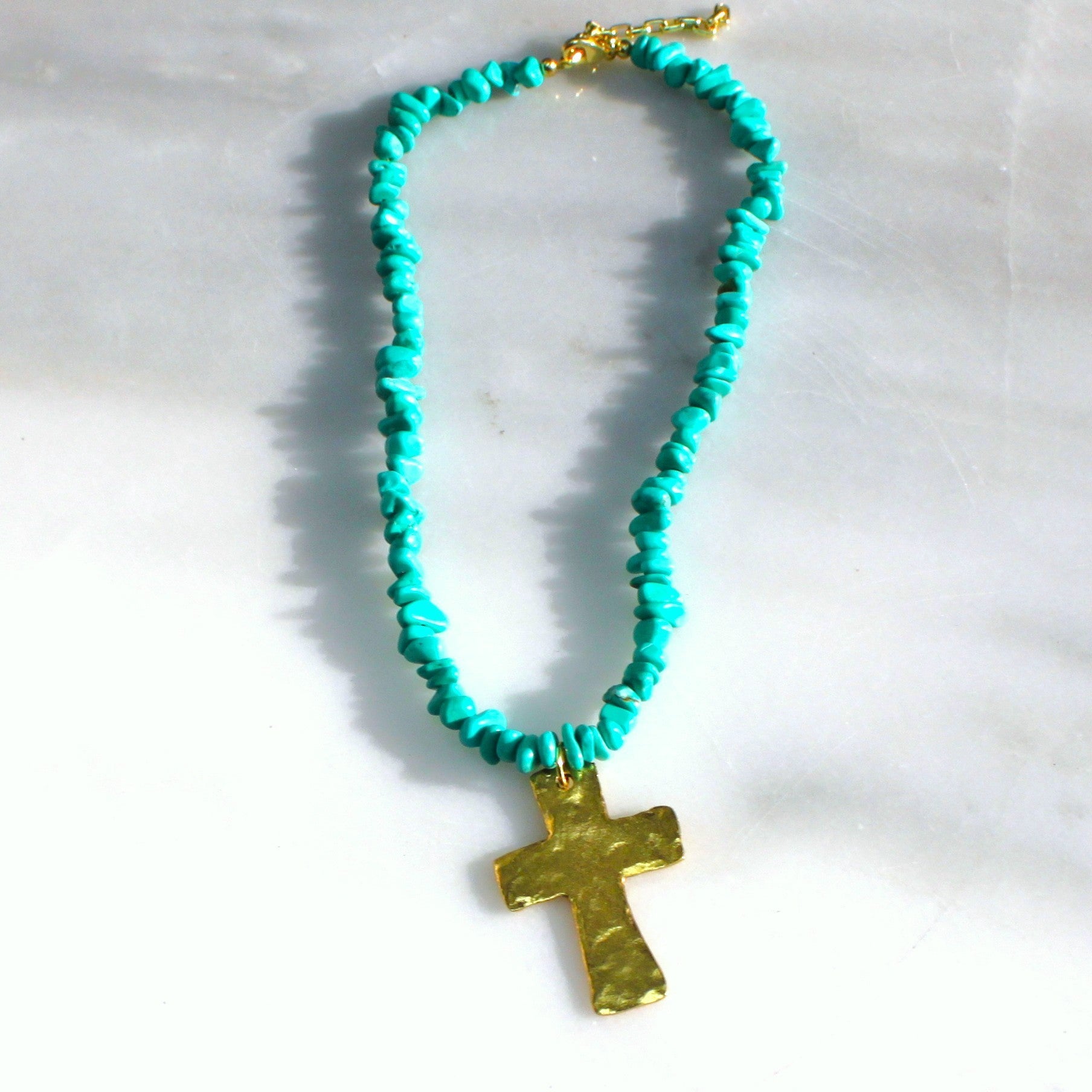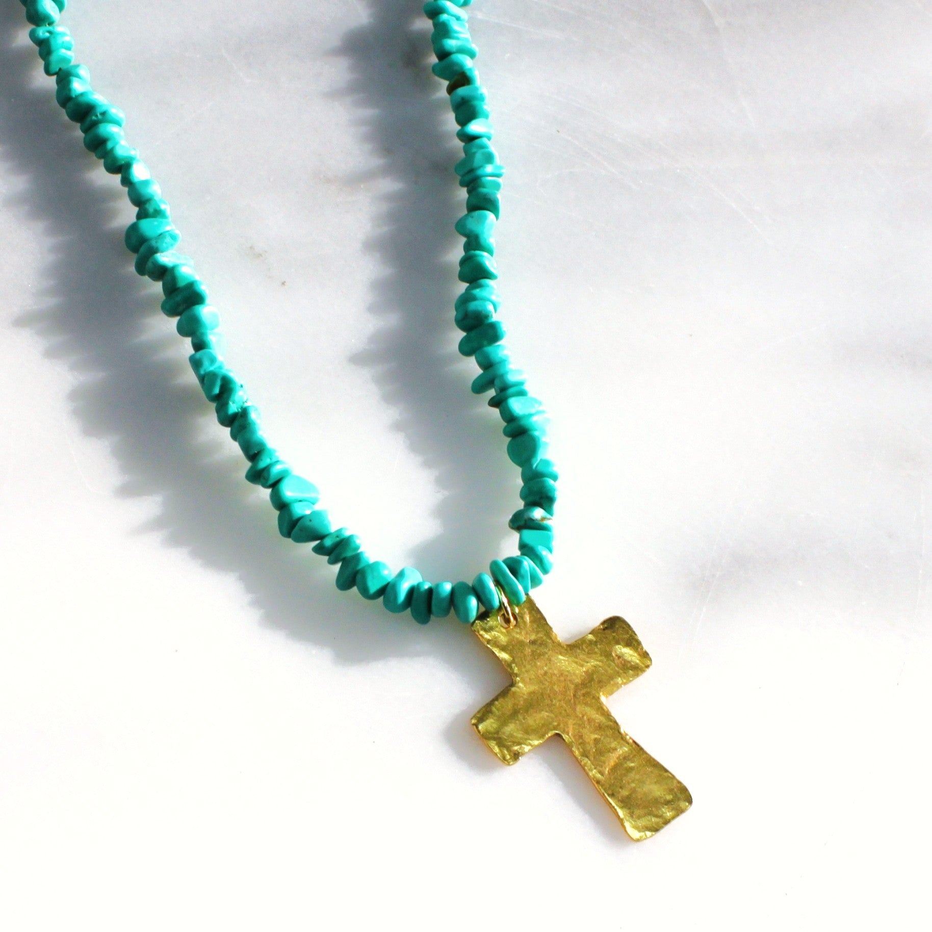 Hand-strung turquoise stones meet a hand-forged gold cross—bold, soulful, and sun-warmed. A modern desert talisman made to layer, wear daily, and carry meaning wherever you go.