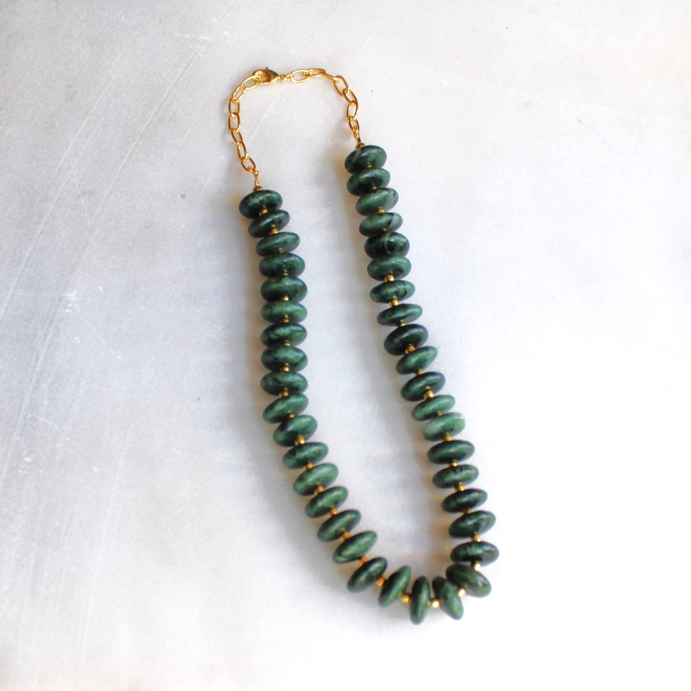 Hand-strung with rich, deep green jade and gold accents, this necklace brings a bold, earthy elegance to any outfit. Each bead is slightly different for a natural, artisan feel, making every piece unique. Finished with a gold link chain at the top for comfort, it layers beautifully or stands alone as a statement necklace.