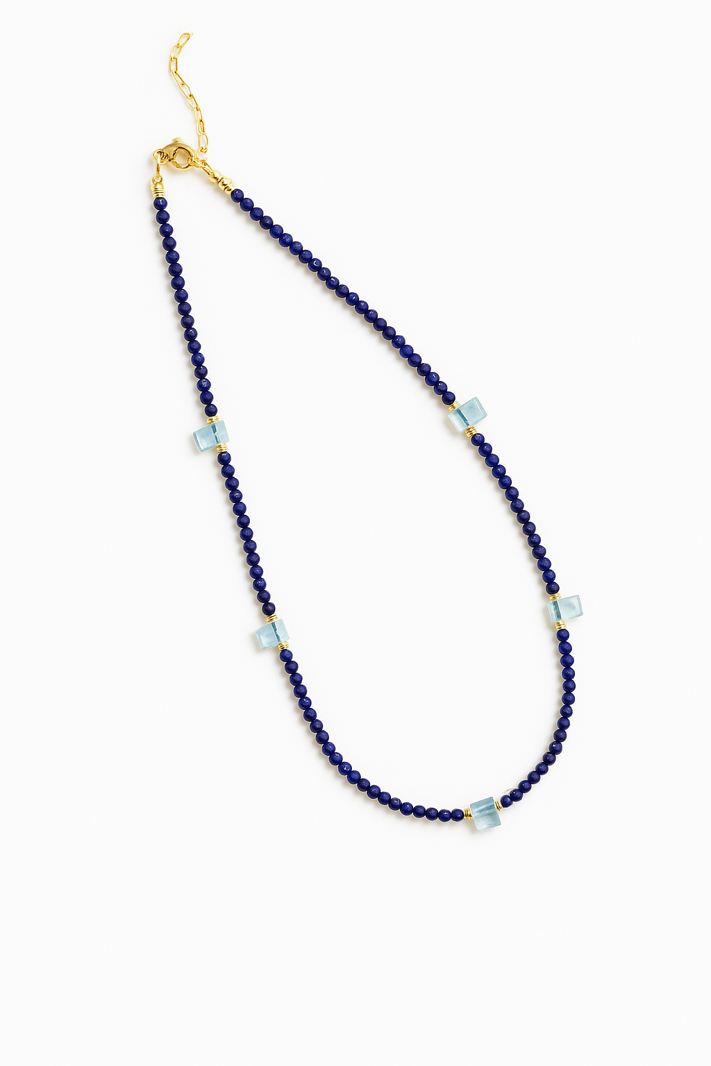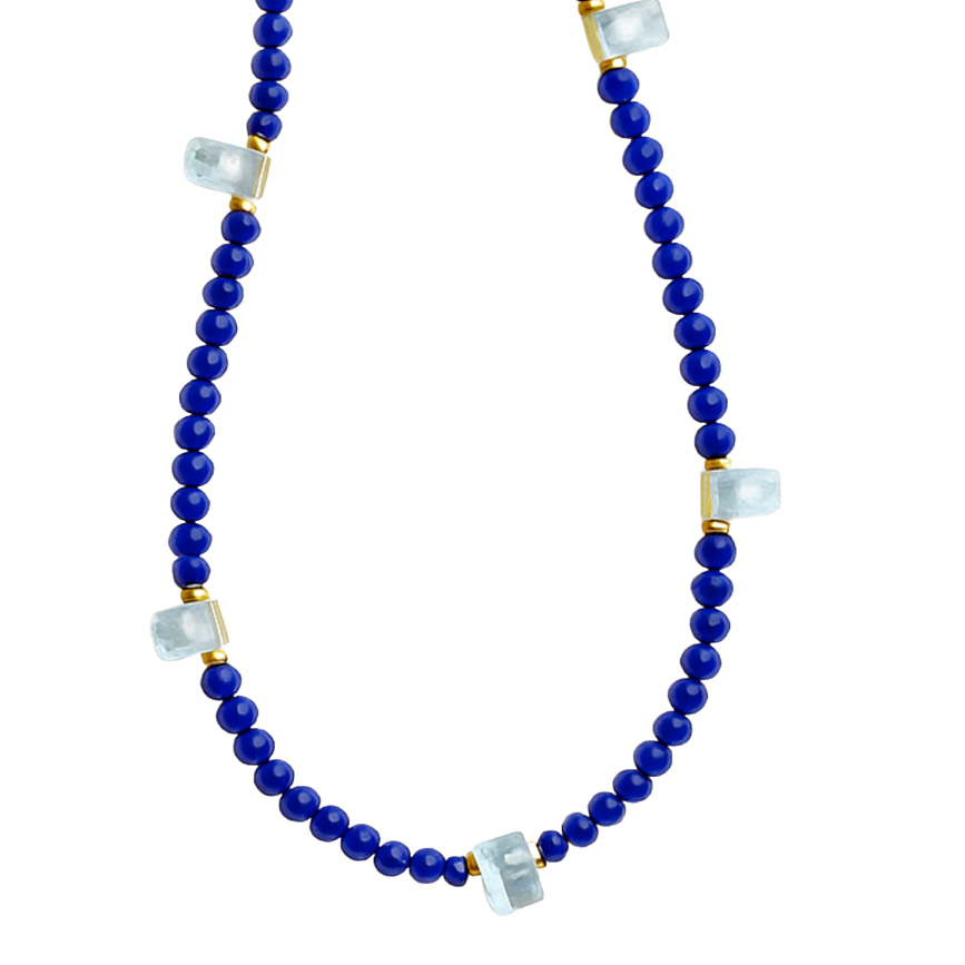 Deep blue lapis meets serene blue topaz, a pairing that feels like desert twilight. Hand-beaded with touches of gold, this necklace brings calm, confidence, and a quiet luxury to your layers.