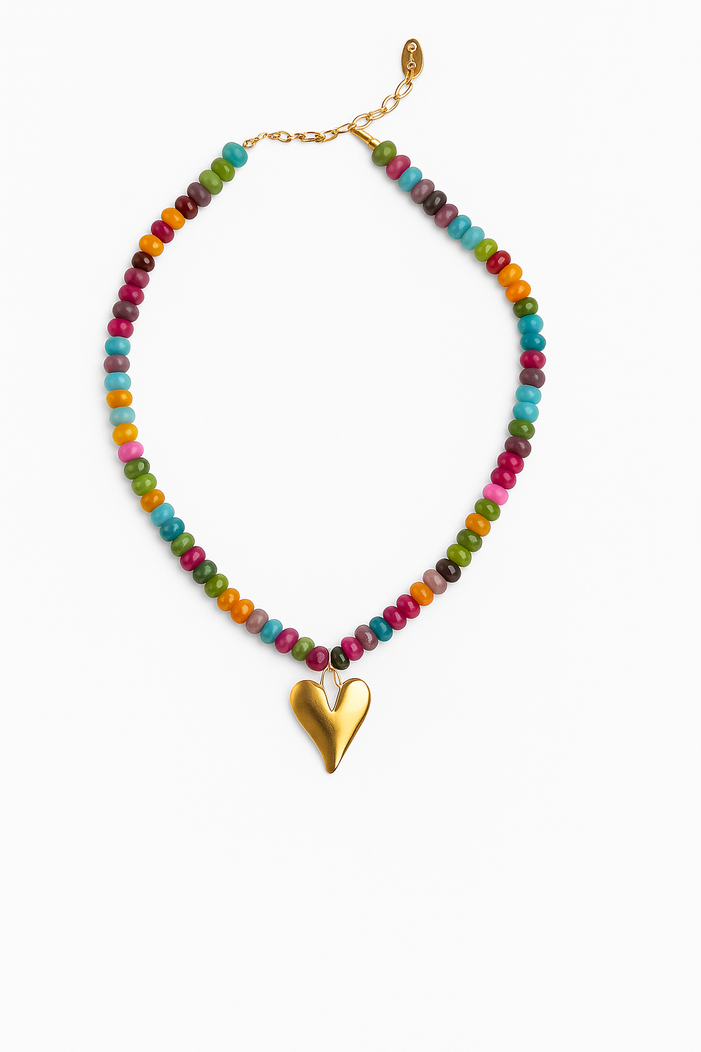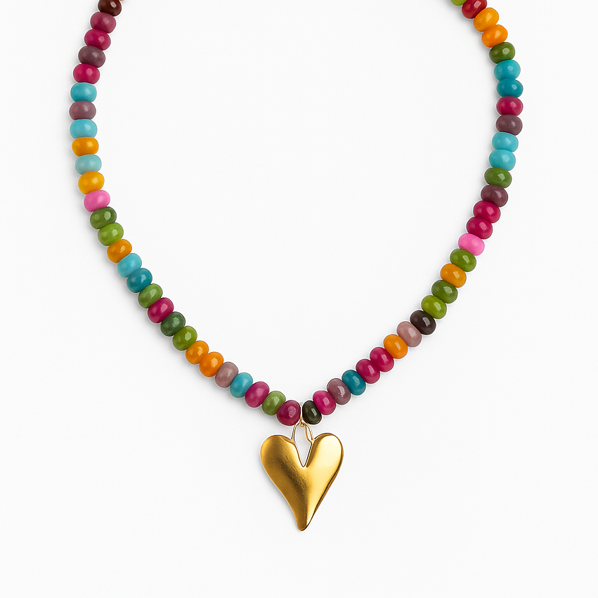 Handmade in the Arizona desert, this colorful gemstone necklace captures the warmth and vibrance of sunlit days. Each bead is hand-strung in a kaleidoscope of turquoise, pink, green, orange, and gold hues — finished with a shining gold heart charm. Perfect for layering or as a meaningful standalone piece, it’s a modern heirloom made to be worn and cherished.