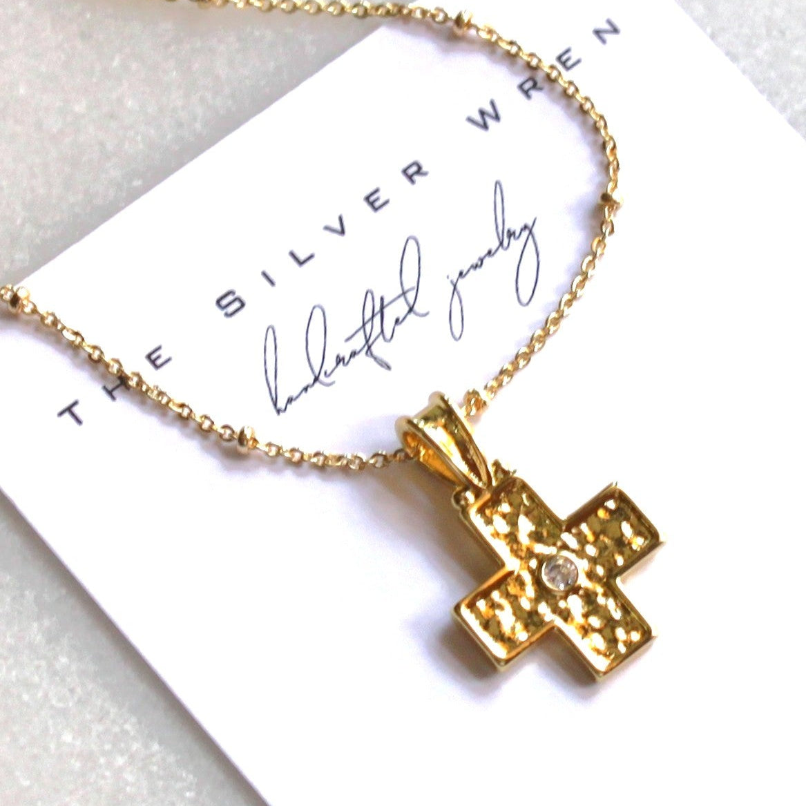 This gold cross pendant necklace is stylish and chic! A cross pendant and dainty gold chain are sure to be your favorite. Handcrafted in the Arizona desert, this piece layers effortlessly with other chains or stands alone as a statement of modern simplicity and soulful style.
